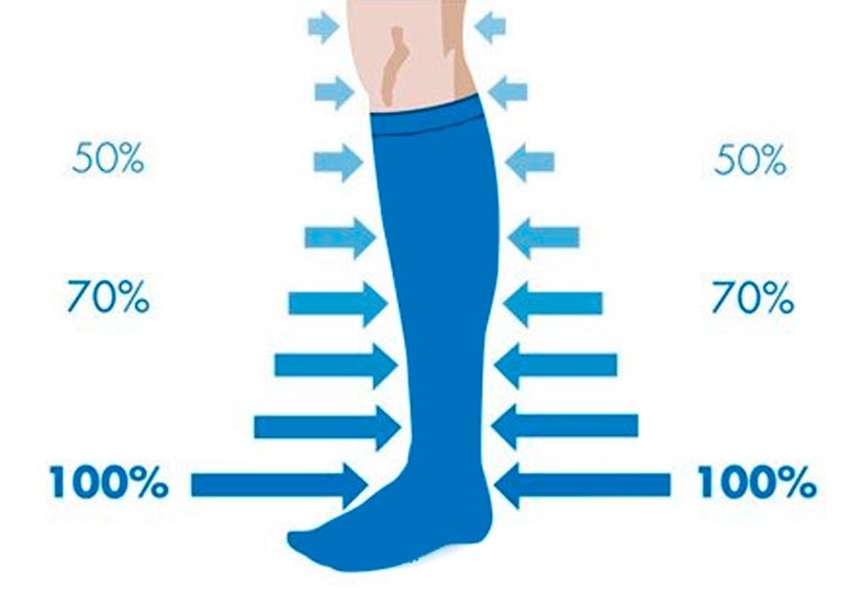 Противоварикозные изделия разработаны и изготовлены так, что на лодыжке компрессия составляет 100 процентов, к колену уменьшается до 75 процентов, у бедра остается 50 процентов компрессии, а к паху 20 процентов. За счет этого противоварикозный трикотаж значительно увеличивает скорость оттока крови от вен нижних конечностей.